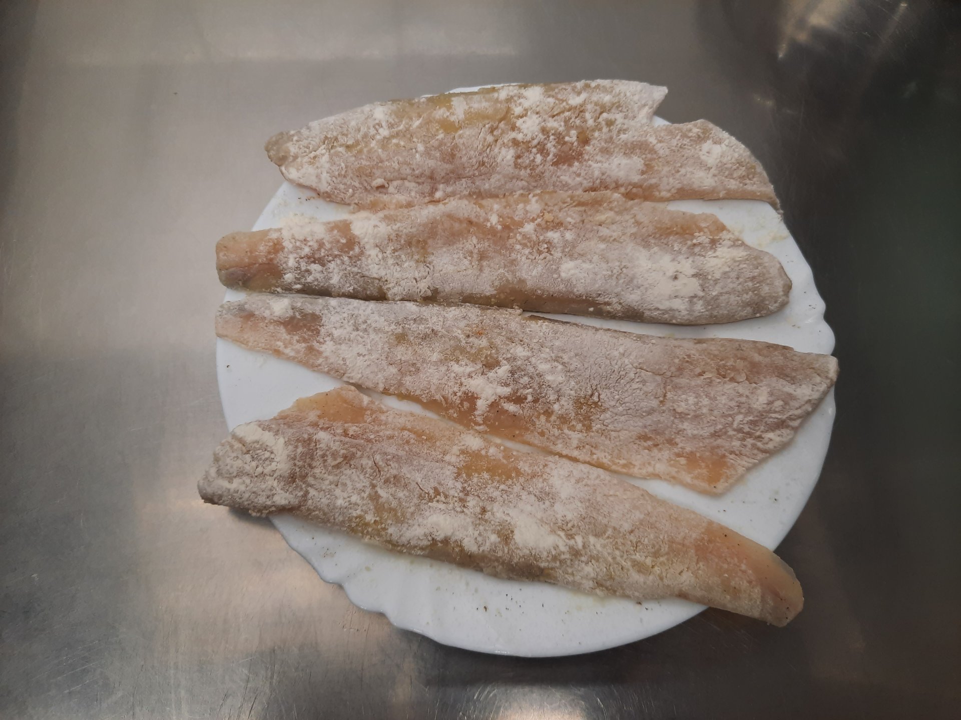 candáta osolíme, opepříme a obalíme v hrubé mouce - kůrčička na candátovi bude hrubší a křupavější