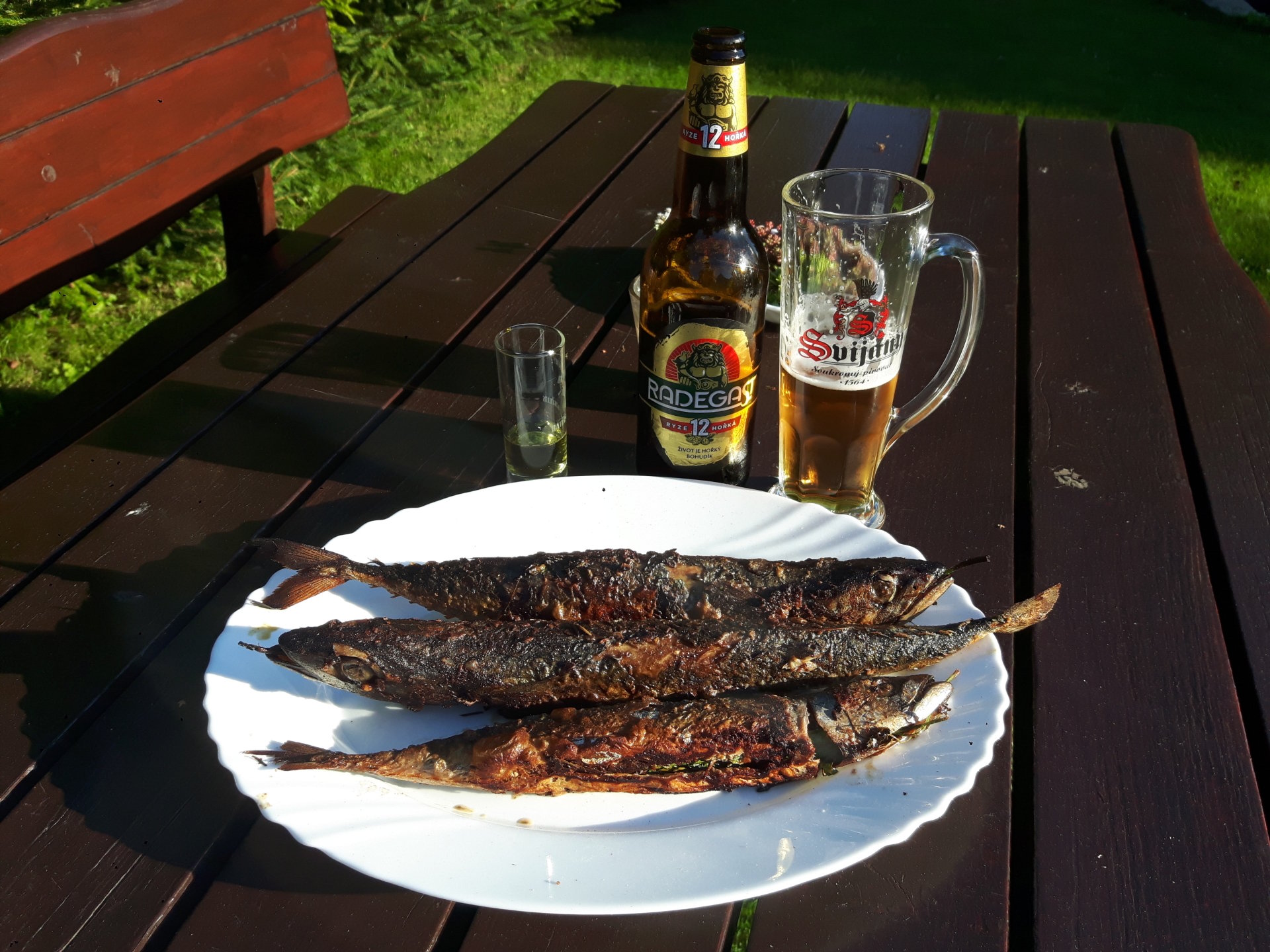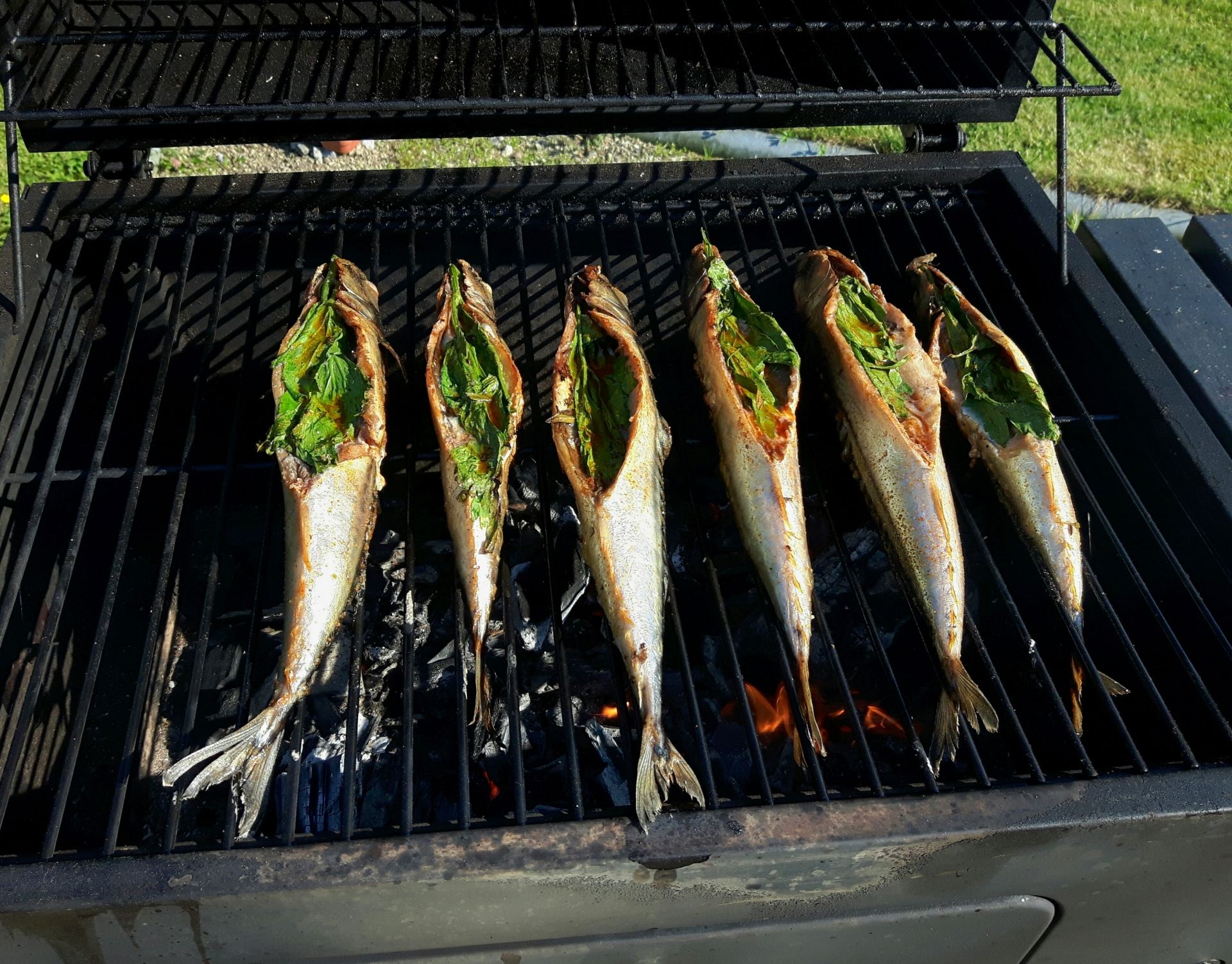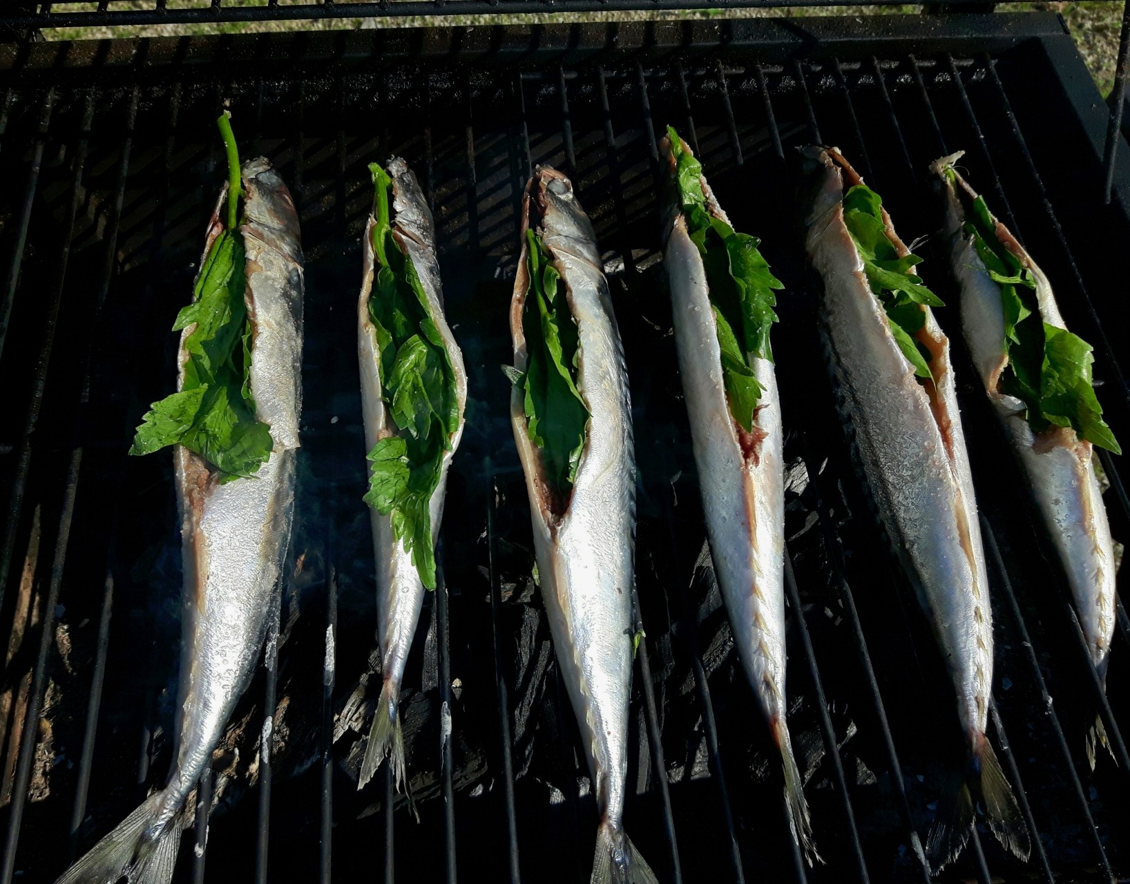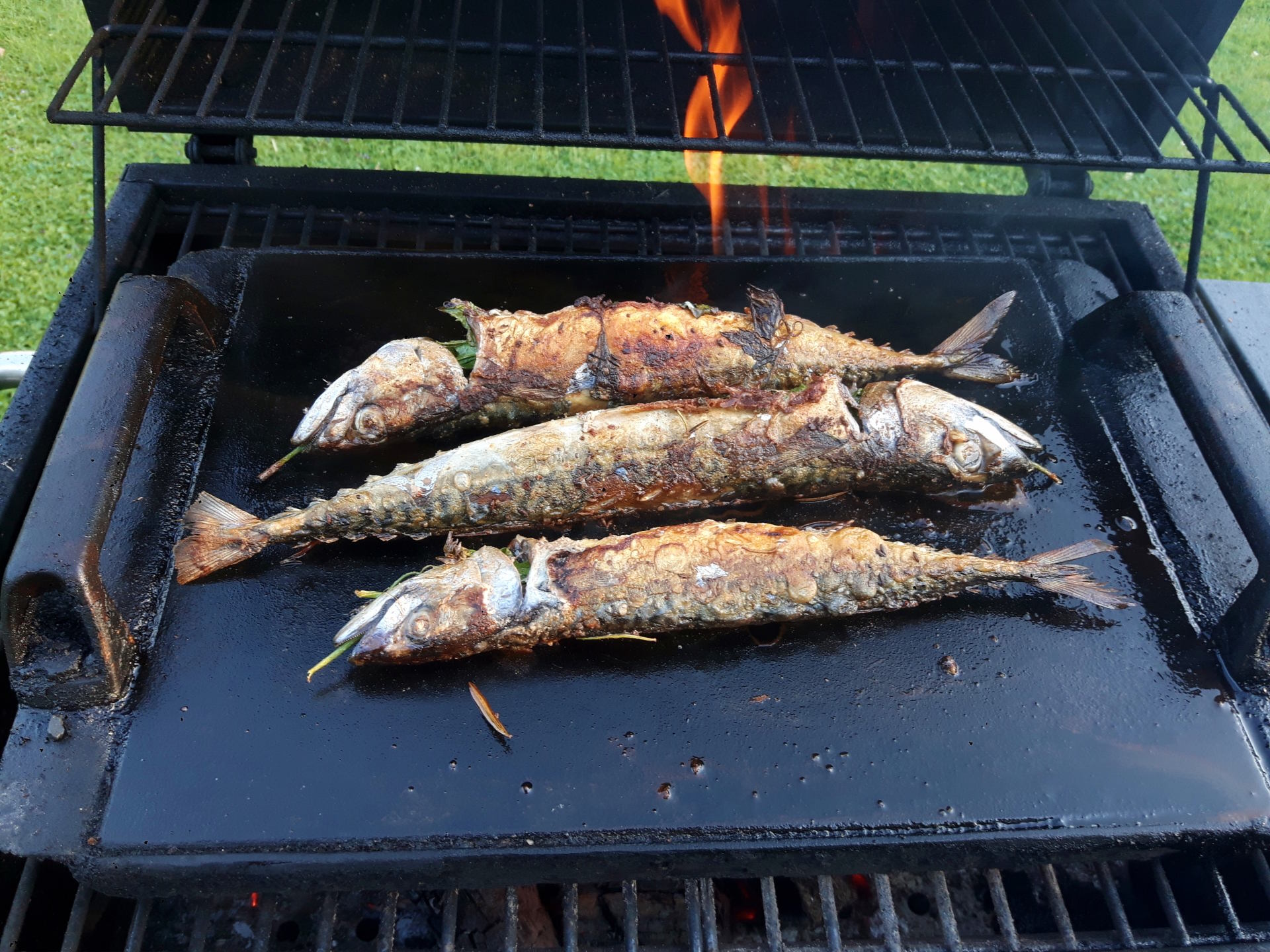 Makrely během grilování mažeme a otáčíme. Případný prudký plamen přihašujeme vodou v pet láhvi s malým otvorem ve víčku.