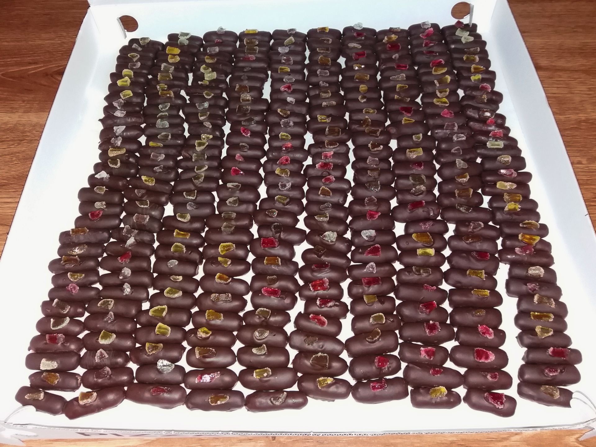 Do mísy dáme pomleté piškoty. Přes lis na česnek přelisujeme želé bonbóny. Vše dohromady smícháme. Dle vlastního uvážení přidáme rum. Těsto nesmí být ani tuhé ani řídké. Na připravený vál, který máme poprášený moučkovým cukrem, vyklopíme směs z mísy a uděláme si váleček, který rozdělíme na stejné kousky z kterých budeme tvořit malé válečky. Připravené válečky dáme do ledničky. Necháme je odpočívat, než si připravíme čokoládovou polevu. Vytáhneme válečky z ledničky a namáčíme je na vidličce v misce v čokoládové polevě. Na vidličce je necháme trochu odkapat, pokládáme je na pečící papír a doprostřed dáme kousek želé bonbónu. Necháme v chladu ztuhnout. Pak jednotlivé válečky odlepíme od pečicího papíru. Přečnívající čokoládu odkrojíme aby cukrovíčko vypadalo dobře.