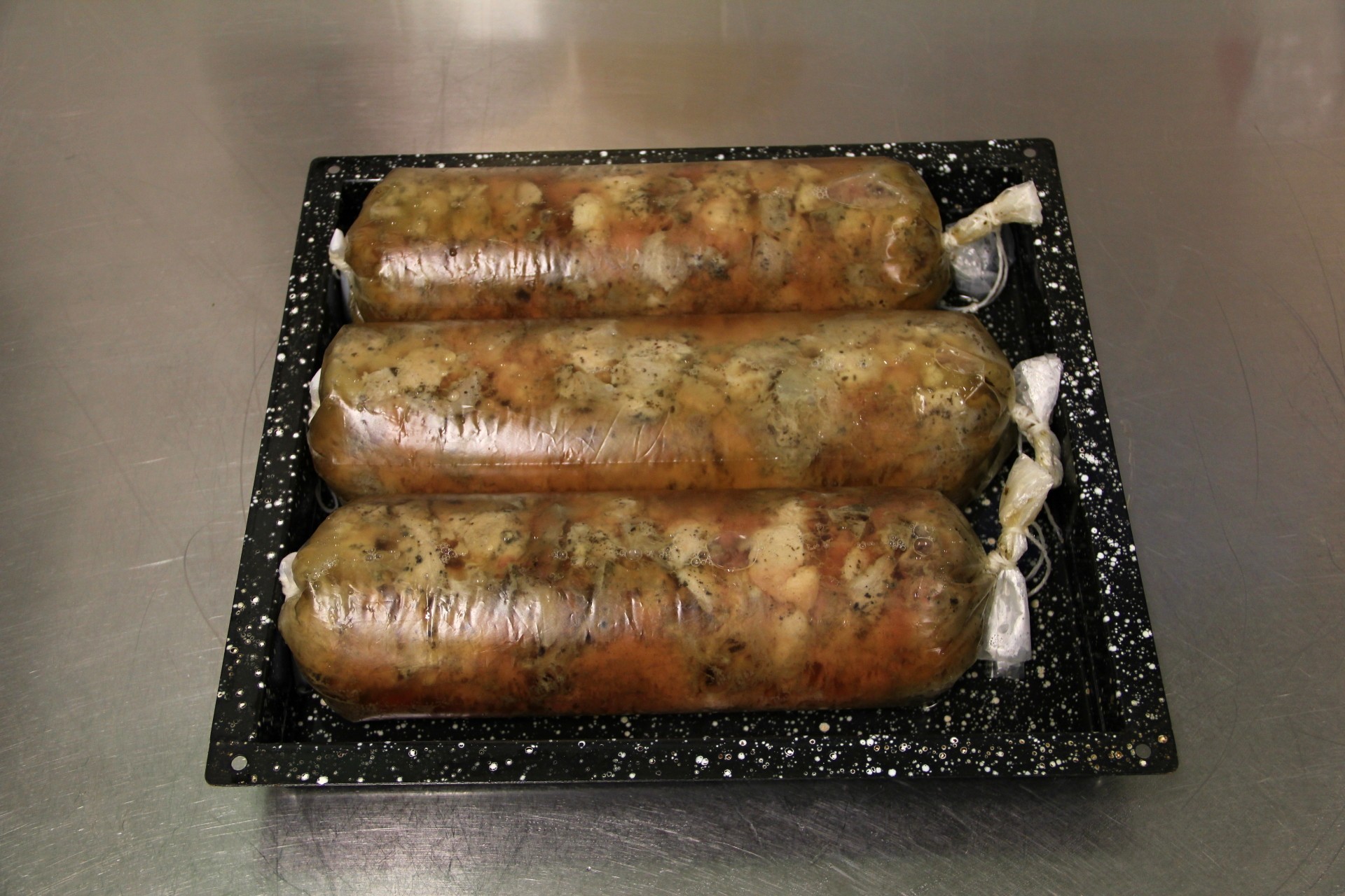 - po uvaření tlačenku po vytažení z konvektomatu promneme mezi prsty tak, aby se maso uvnitř rovnoměrně rozložilo v objemu